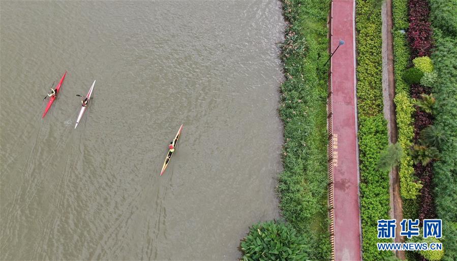 6月15日,劃艇運(yùn)動員在茅洲河上訓(xùn)練(無人機(jī)照片)。新華社記者 鄧華 攝