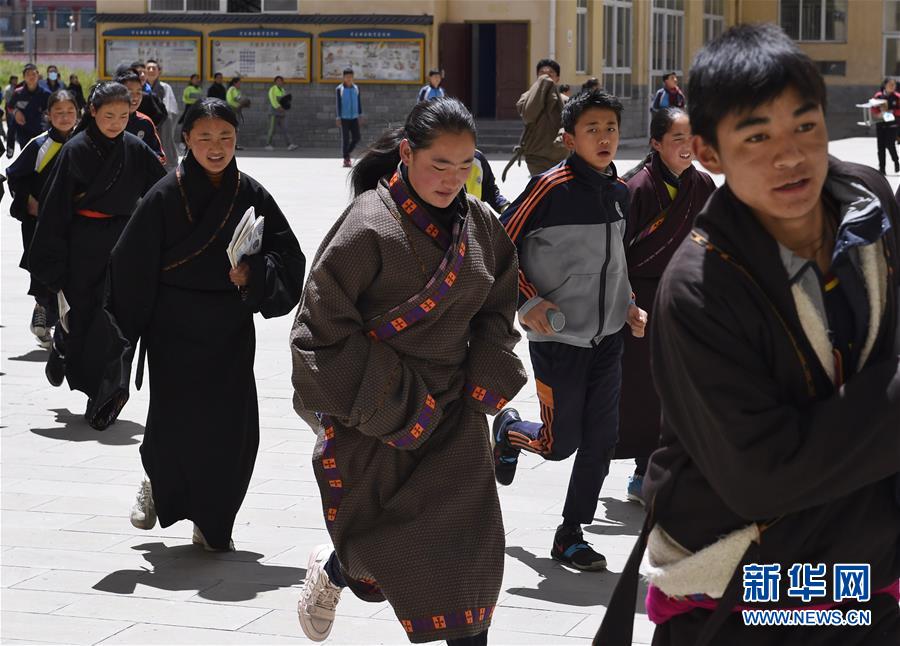 6月14日,阿壩縣藏文中學學生午休后步入教室準備上課。新華社記者 劉坤 攝