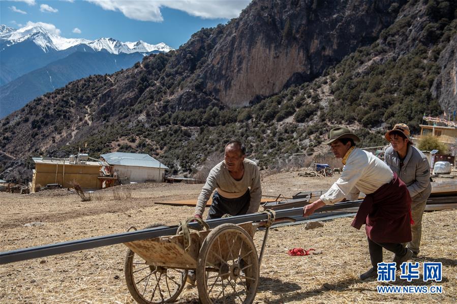 德欽縣佛山鄉(xiāng)江坡村說(shuō)打村村民斯那定主(中)和村民一起搬運(yùn)建筑材料(3月14日攝)。新華社記者 胡超 攝