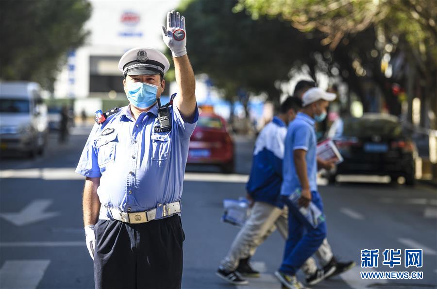 6月20日,在烏魯木齊市第二中學(xué)門前,烏魯木齊市公安局交警支隊(duì)天山區(qū)大隊(duì)新華路中隊(duì)警官艾力夏提·哈力木然提在指揮交通。當(dāng)日,烏魯木齊市初中升高中考試開(kāi)始。為保障為期三天的中考順利進(jìn)行,烏魯木齊市公安局交警支隊(duì)在各考點(diǎn)執(zhí)勤,為考生保駕護(hù)航新華社記者 王菲 攝