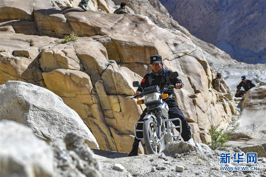 新疆塔什庫爾干塔吉克自治縣熱斯喀木村護邊員其拉克·買買熱依木(前)騎摩托車巡邏(2019年7月5日攝)。新華社記者胡虎虎攝