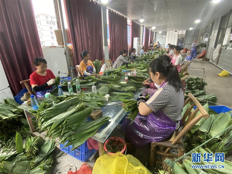6月16日,桑植金橋農(nóng)產(chǎn)品有限責(zé)任公司的員工對(duì)粽葉進(jìn)行選葉、分級(jí)。新華社記者阮周?chē)鷶z