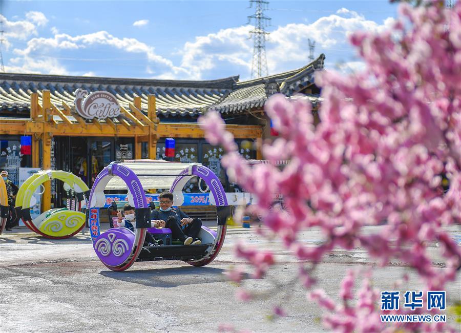 在吉林省延邊朝鮮族自治州和龍市西城鎮(zhèn)金達(dá)萊民俗村,村民在村內(nèi)的咖啡館前體驗(yàn)親子游樂項(xiàng)目(5月6日攝)。新華社記者許暢攝