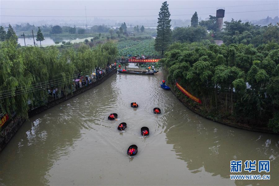 6月23日,東林鎮(zhèn)村民在泉心村荷花池參加端午劃菱桶趣味活動(無人機(jī)照片)。當(dāng)日,浙江省湖州市東林鎮(zhèn)在泉心村荷花池舉辦“慶端午劃菱桶”趣味活動。村民們劃著菱桶在水面上你追我趕,同時(shí)采收荷花和蓮蓬,呈現(xiàn)出水鄉(xiāng)特有的端午節(jié)日氛圍。在河網(wǎng)密布的東林鎮(zhèn),菱桶是水鄉(xiāng)家家戶戶都有的一種傳統(tǒng)水上勞動工具,村民在捕魚、采菱、采荷時(shí)都要用到。新華社記者徐昱攝