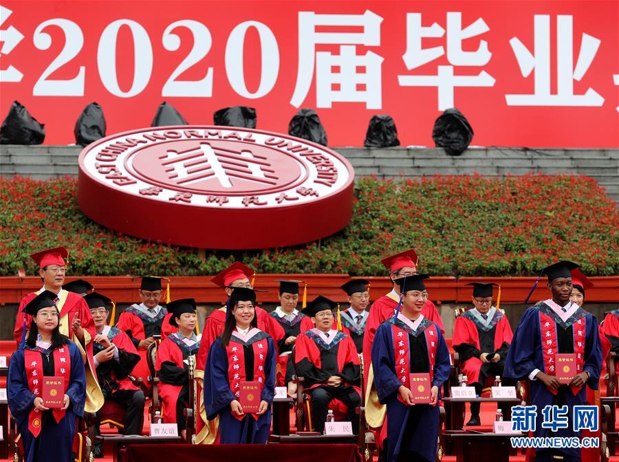6月23日,在華東師范大學閔行校區(qū)的畢業(yè)典禮上,優(yōu)秀畢業(yè)生代表接受表彰。當日,華東師范大學舉行2020屆畢業(yè)典禮。由于疫情防控需要,今年的典禮在兩個校區(qū)分別舉辦,并全程在線直播。約7700名華東師范大學2020屆畢業(yè)生通過現場或“云端”的方式參加畢業(yè)典禮。新華社記者劉穎攝