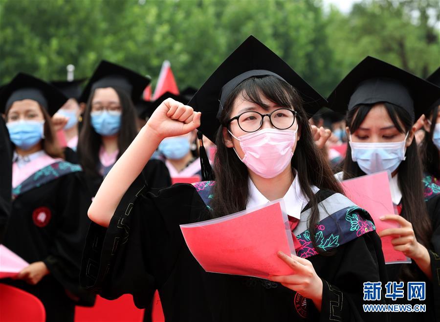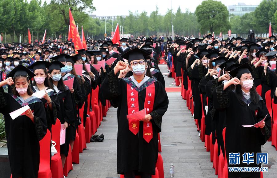 6月23日,在華東師范大學閔行校區(qū)的畢業(yè)典禮上,師范專業(yè)的畢業(yè)生舉行宣誓儀式。當日,華東師范大學舉行2020屆畢業(yè)典禮。由于疫情防控需要,今年的典禮在兩個校區(qū)分別舉辦,并全程在線直播。約7700名華東師范大學2020屆畢業(yè)生通過現場或“云端”的方式參加畢業(yè)典禮。新華社記者劉穎攝