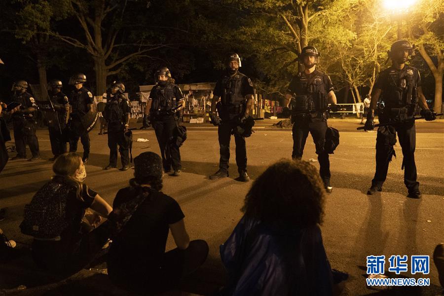 6月22日,警察和示威者在美國(guó)華盛頓白宮附近對(duì)峙。美國(guó)警察和示威者22日晚在首都華盛頓市白宮北側(cè)拉斐特廣場(chǎng)發(fā)生沖突并對(duì)峙。美國(guó)總統(tǒng)特朗普在社交媒體上說(shuō),許多人因破壞廣場(chǎng)上美國(guó)前總統(tǒng)安德魯·杰克遜的雕像及附近圣約翰圣公會(huì)教堂被逮捕。新華社記者劉杰攝