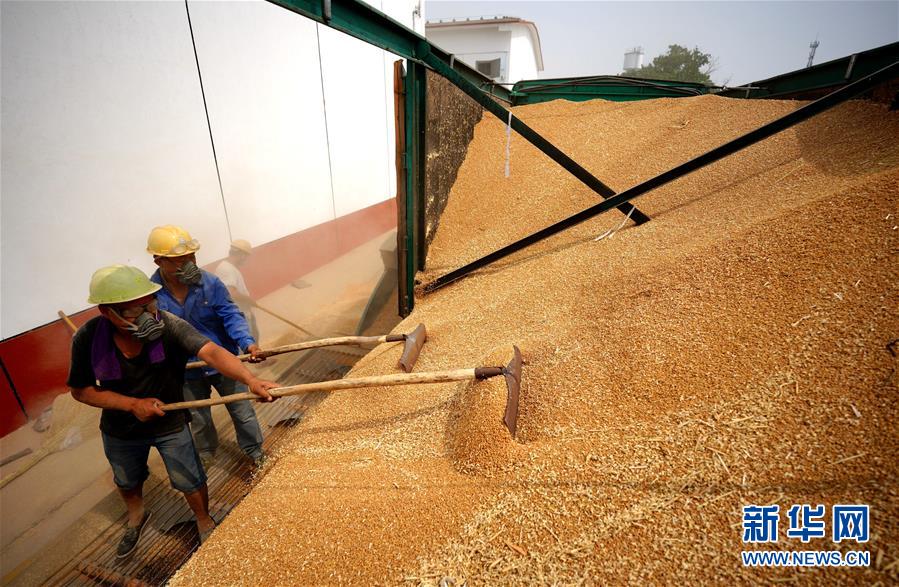 6月23日,在河北柏鄉(xiāng)國家糧食儲備庫,工作人員將小麥入庫。麥?zhǔn)者^后,河北柏鄉(xiāng)國家糧食儲備庫積極騰倉納糧,做好夏糧收儲入庫工作,確保農(nóng)民順利賣糧。新華社記者王曉攝