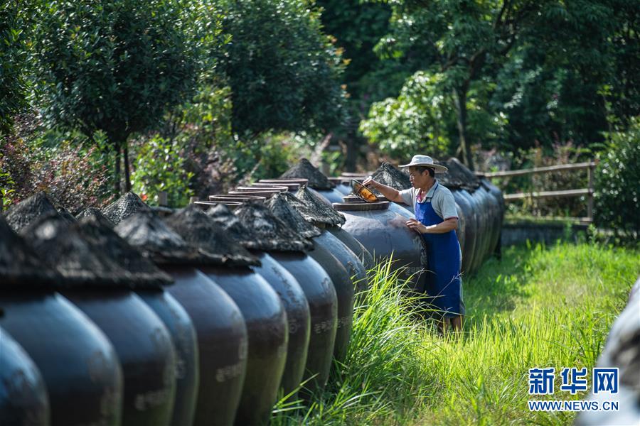 6月26日,工人在查看醋的晾曬情況。新華社記者 陶亮 攝