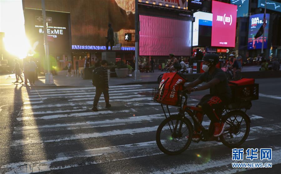 6月27日,一名送貨員騎車經(jīng)過美國紐約時(shí)報(bào)廣場。美國約翰斯·霍普金斯大學(xué)27日發(fā)布的新冠疫情最新統(tǒng)計(jì)數(shù)據(jù)顯示,截至美國東部時(shí)間27日16時(shí)35分(北京時(shí)間28日4時(shí)35分),美國累計(jì)新冠確診病例2500419例,累計(jì)死亡病例125434例。新華社記者王迎攝