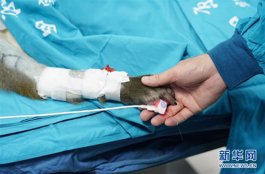 6月29日,研究人員在病房?jī)?nèi)為移植肝受體猴按摩手部。日前,多基因編輯豬-恒河猴異種肝、心、腎器官移植在位于陜西西安的空軍軍醫(yī)大學(xué)西京醫(yī)院順利實(shí)施。研究團(tuán)隊(duì)使用豬內(nèi)源性逆轉(zhuǎn)錄病毒(PERV)敲除的13個(gè)基因修飾豬作為供體,將一個(gè)供體豬的肝、心、腎分別移植給3只恒河猴受體。目前,移植肝和對(duì)應(yīng)的受體猴已存活16天,突破國(guó)際上的豬-猴輔助性肝移植最長(zhǎng)存活時(shí)間記錄。這項(xiàng)研究有助于未來(lái)解決器官短缺造成的臨床器官移植發(fā)展受限難題。新華社記者邵瑞攝