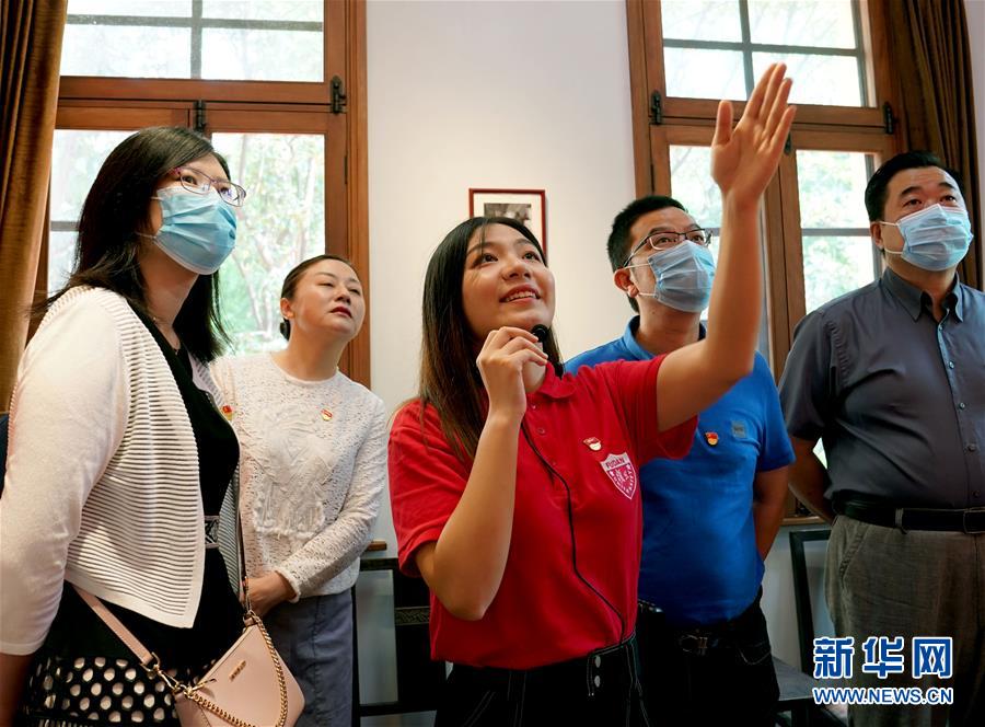 6月30日,復旦大學《共產黨宣言》展示館黨員志愿服務隊隊員、復旦大學馬克思主義學院博士生陸婷婷(中)在為觀眾講解。新華社記者劉穎攝
