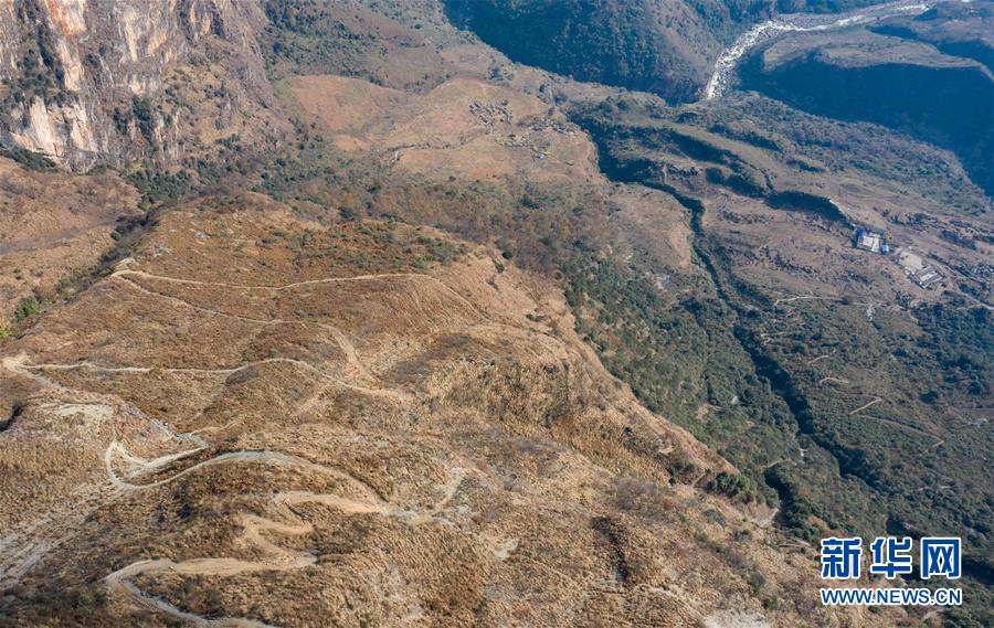 俯瞰通往阿布洛哈村的羊腸小道(2019年12月27日攝,無(wú)人機(jī)照片)。新華社記者江宏景攝