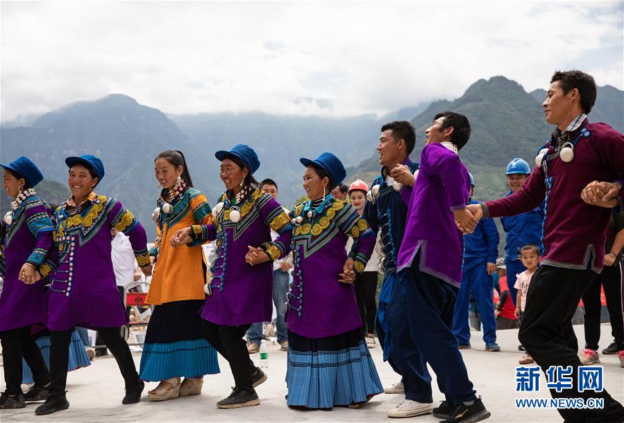 6月29日,阿布洛哈村村民身著彝族傳統(tǒng)服飾載歌載舞慶祝通村公路通車(chē)。新華社記者江宏景攝