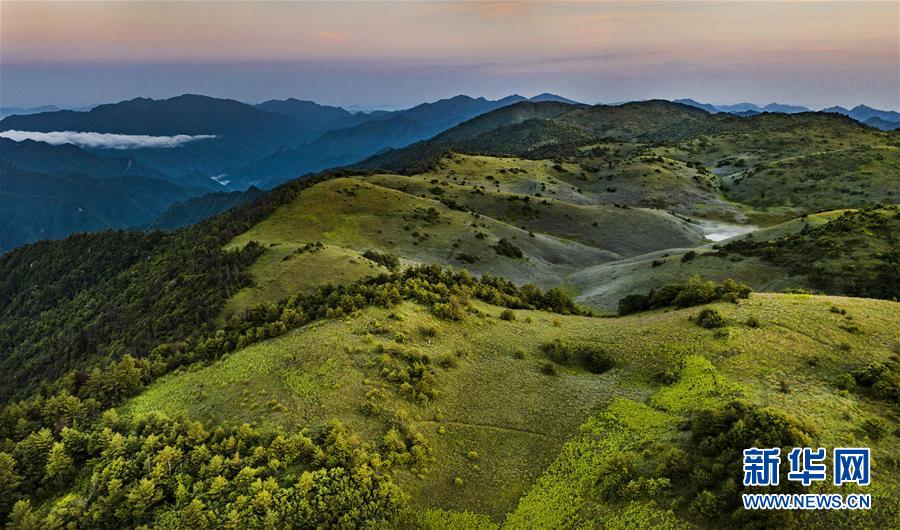 6月30日,晨曦中的神田草甸(無(wú)人機(jī)照片)。位于陜西省安康市嵐皋縣與重慶市城口縣交界處大巴山神田主脊北坡的神田草甸,面積超過(guò)1.1萬(wàn)畝。夏日的朝霞中,起伏的草甸仿佛一塊寬大無(wú)邊的綠色地毯,鑲嵌在大巴山上,如詩(shī)如畫(huà)。新華社記者陶明攝