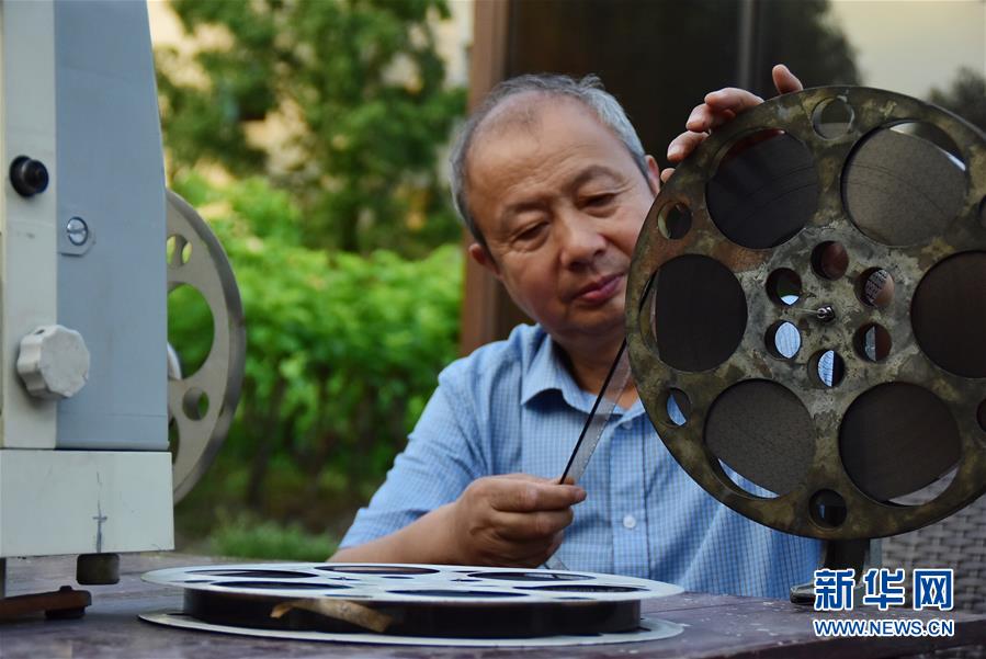 6月30日,朱生榮在當(dāng)晚電影開播前將膠片調(diào)至起始幀。新華社記者鄭夢雨攝