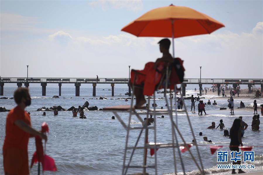 7月1日,人們在美國紐約科尼島戲水。當日,美國紐約市屬八處海灘正式重新準許民眾游泳,救生員也同時上崗。新華社記者王迎攝