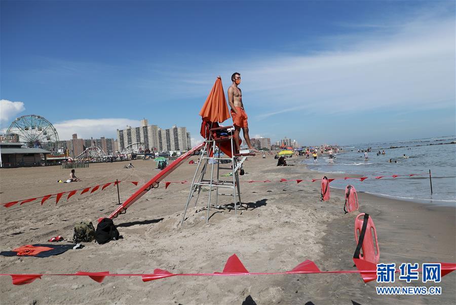 7月1日,救生員在美國(guó)紐約科尼島的一處海灘查看海面情況。當(dāng)日,美國(guó)紐約市屬八處海灘正式重新準(zhǔn)許民眾游泳,救生員也同時(shí)上崗。新華社記者王迎攝