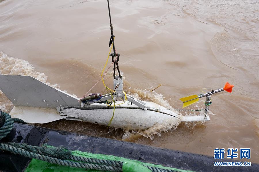 7月2日,裝有流速測(cè)量?jī)x器的鉛魚(yú)完成測(cè)量作業(yè)后,由吊車吊出長(zhǎng)江水面。新華社記者劉潺攝