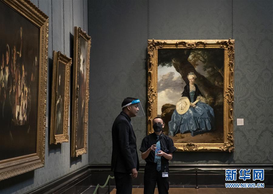 7月4日,工作人員在英國國家美術(shù)館內(nèi)交談。新華社記者韓巖攝