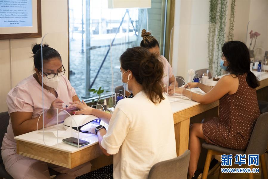7月6日,技師在美國紐約一家美甲店為顧客美甲。當(dāng)天,紐約進(jìn)入重啟第三階段,美甲店、按摩店等個(gè)人護(hù)理業(yè)在經(jīng)歷近4個(gè)月的停業(yè)后被允許重新開放。因防疫需要,原本應(yīng)在第三階段開放的餐飲業(yè)室內(nèi)就餐仍處于暫停狀態(tài)。新華社記者王迎攝