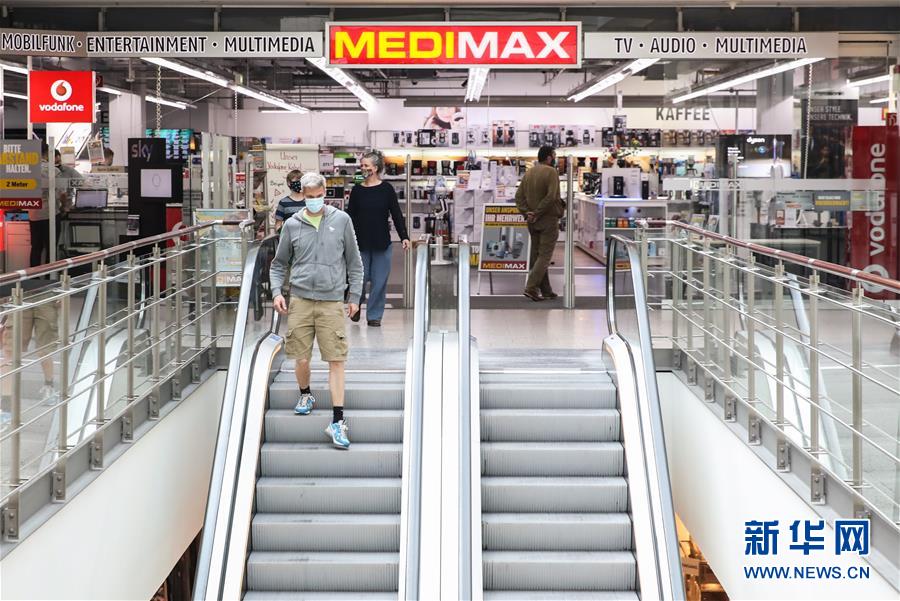 7月7日,佩戴口罩的顧客在德國首都柏林一家購物中心購物。針對有地方官員呼吁取消民眾乘坐公交車和在商場購物時須戴口罩的規(guī)定,德國聯(lián)邦政府6日表示,支持延續(xù)“口罩強制令”。4月底,德國全部16個聯(lián)邦州陸續(xù)出臺“口罩強制令”,即居民在乘坐公交車和購物時須佩戴口罩。新華社記者單宇琦攝