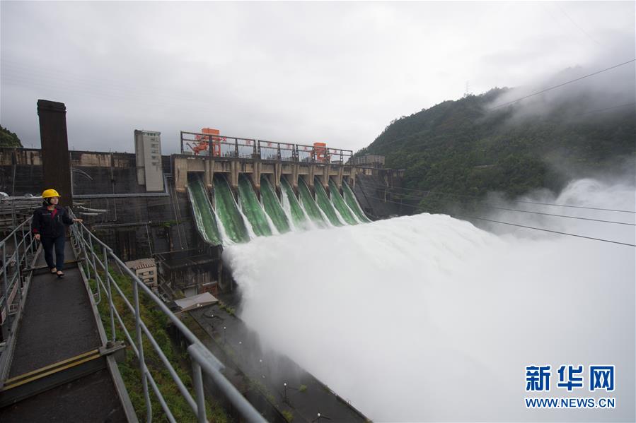 7月8日,新安江水庫(kù)開(kāi)啟9孔泄洪,工作人員在新安江電廠(chǎng)開(kāi)關(guān)站上進(jìn)行設(shè)備巡查。新華社記者翁忻旸攝