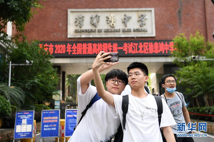 7月8日,在重慶市徐悲鴻中學(xué)考點(diǎn),考生在考試結(jié)束后在校門口合影。當(dāng)日,全國部分地區(qū)2020年高考結(jié)束。新華社記者唐奕攝