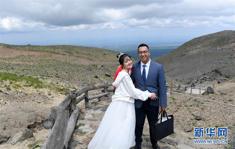 7月8日,一對(duì)新人在長(zhǎng)白山北景區(qū)主峰上拍照。新華社記者林宏攝