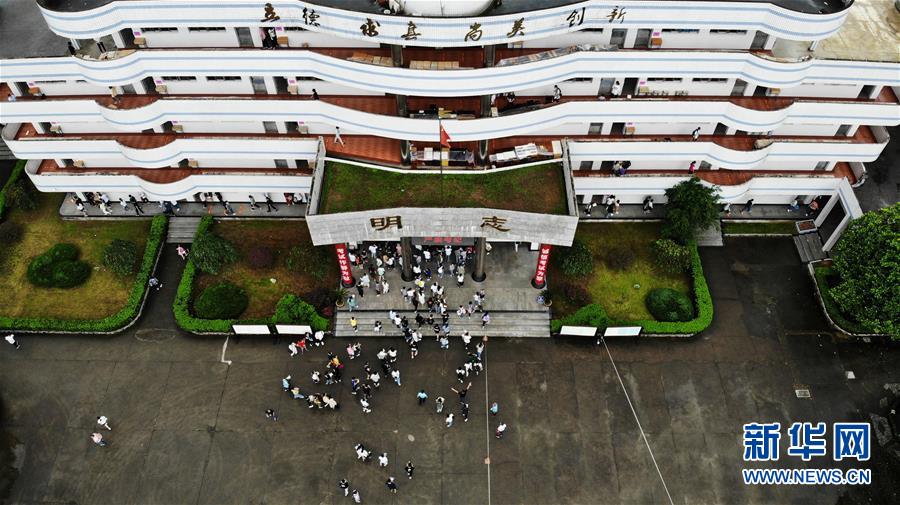 7月9日,考生進(jìn)入歙縣第二中學(xué)考點(diǎn)(無(wú)人機(jī)照片)。受強(qiáng)降雨影響,2020年高考安徽歙縣考區(qū)7月7日未能如期開考,經(jīng)研究并報(bào)教育部批準(zhǔn),歙縣考區(qū)于9日啟用2020年普通高等學(xué)校招生全國(guó)統(tǒng)一考試語(yǔ)文、數(shù)學(xué)(文、理)科目副題進(jìn)行考試。新華社記者黃博涵攝