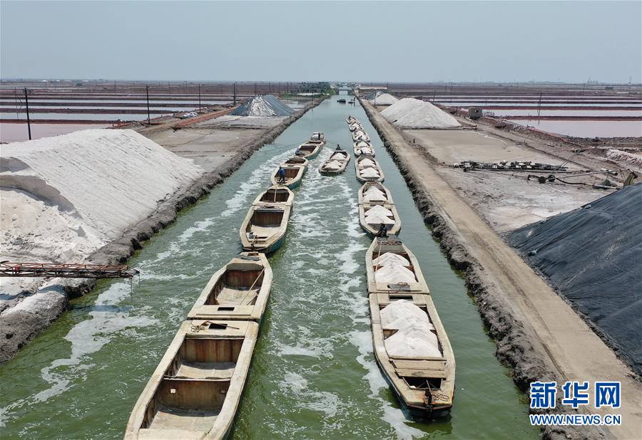 7月9日,唐山市曹妃甸區(qū)南堡鹽場的運(yùn)鹽船只在運(yùn)輸河道內(nèi)行駛(無人機(jī)照片)。在我國長蘆鹽區(qū)海鹽生產(chǎn)基地之一的河北省唐山市曹妃甸區(qū)南堡鹽場,一年一度的春鹽收獲工作即將結(jié)束,今年南堡鹽場的春鹽產(chǎn)量預(yù)計(jì)可達(dá)72萬噸。新華社記者楊世堯攝