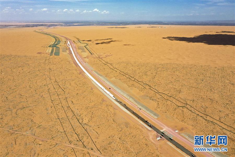 7月10日,位于寧夏境內(nèi)的烏瑪高速青銅峽至中衛(wèi)段A10標(biāo)段在施工中(無人機(jī)照片)。盛夏時(shí)節(jié),位于寧夏境內(nèi)的烏瑪(內(nèi)蒙古烏海市至青海瑪沁縣)高速青銅峽至中衛(wèi)段正在抓緊施工建設(shè)。該路段主線全長122.9公里,其中穿越騰格里沙漠腹地的18公里公路是寧夏建設(shè)的首條沙漠高速公路,預(yù)計(jì)2021年建成通車。新華社記者馮開華攝。