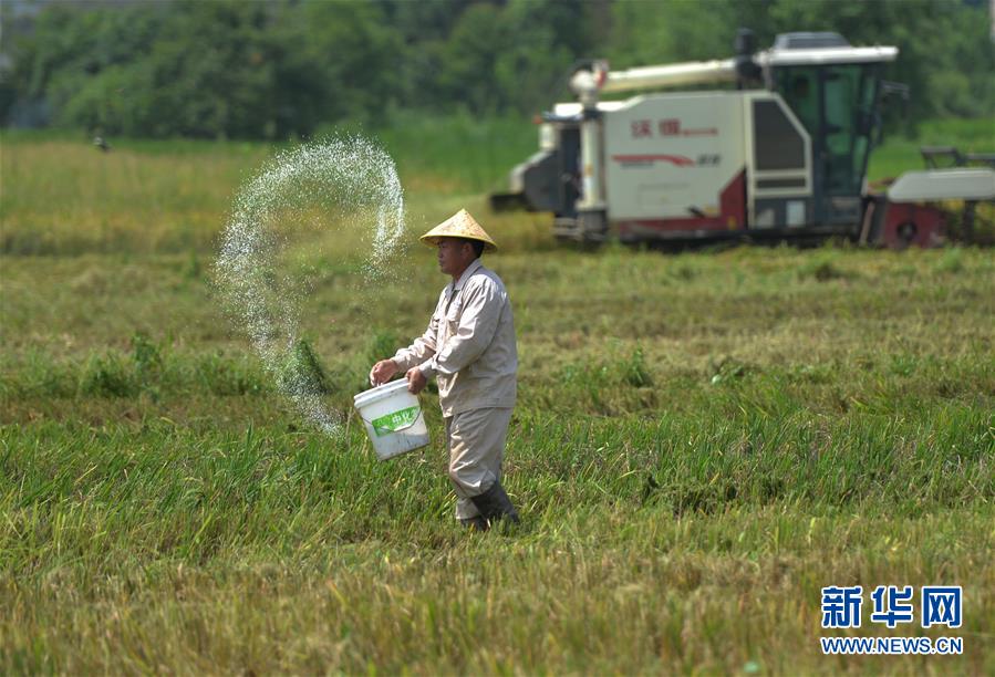 7月11日,村民在湖南省衡陽市衡陽縣臺源鎮(zhèn)臺九村收割后的稻田施肥,為種植晚稻做準備。近日,湖南各地農村陸續(xù)進入“雙搶”季,農民緊抓農時,搶收搶種,力爭糧食穩(wěn)產豐收。新華社記者趙眾志攝