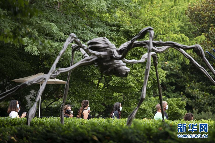 7月11日,在美國(guó)華盛頓,人們戴著口罩在國(guó)家藝術(shù)畫廊雕塑公園游覽。新華社記者劉杰攝