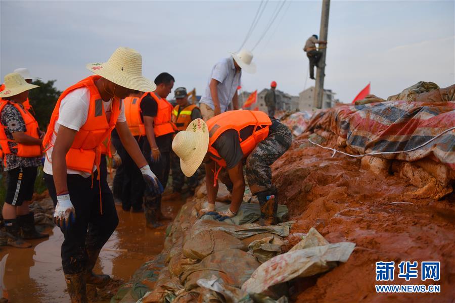 在江西鄱陽縣昌江圩,武警江西總隊機(jī)動支隊的工作人員和當(dāng)?shù)卮迕褚黄鸺庸疼椎蹋?月12日攝)。新華社記者 胡晨歡 攝