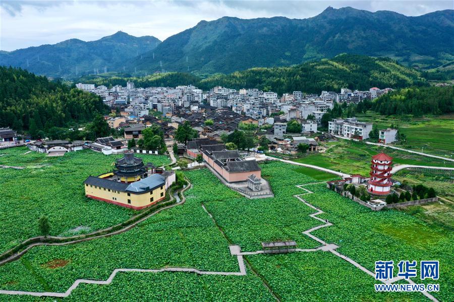 7月3日,浦源村鯉魚溪公園內(nèi)荷花盛開,吸引游人前來觀賞(無人機照片)。新華社記者 姜克紅 攝