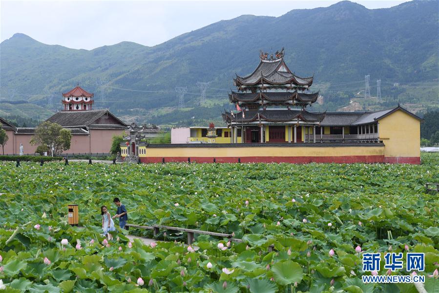 7月3日,浦源村鯉魚溪公園內(nèi)荷花盛開,吸引游人前來觀賞(無人機照片)。新華社記者 姜克紅 攝