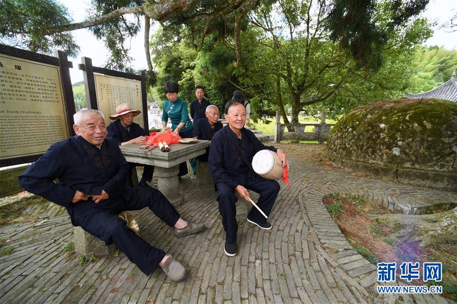 7月4日,幾名參加魚(yú)祭習(xí)俗展示的浦源村民在樹(shù)蔭下休息。魚(yú)祭習(xí)俗是為死去的鯉魚(yú)舉行送葬儀式,是浦源村特有的習(xí)俗。新華社記者 姜克紅 攝