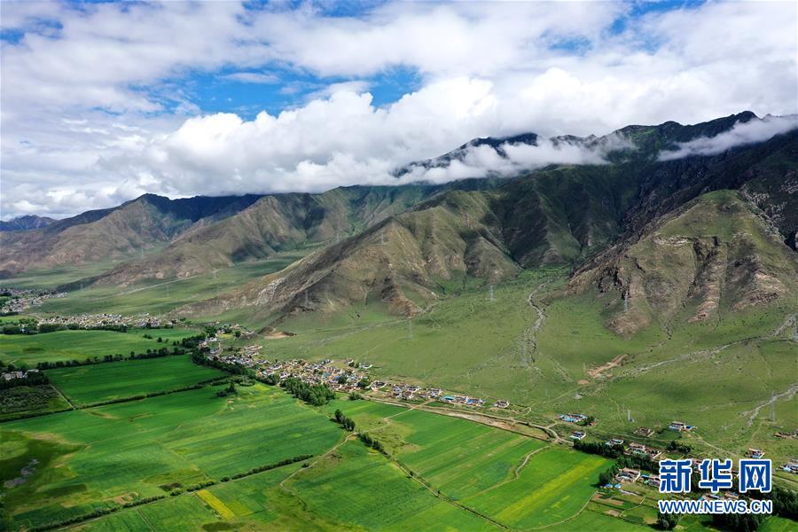 拉薩市林周縣江熱夏鄉(xiāng)田園景色(7月14日攝,無人機照片)。林周縣地處西藏中部,拉薩河上游。夏日時節(jié),這里水草豐茂,綠意盎然,河流、村落、農田組成一幅美麗的田園畫卷。新華社記者 詹彥 攝