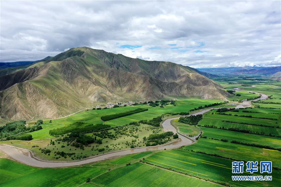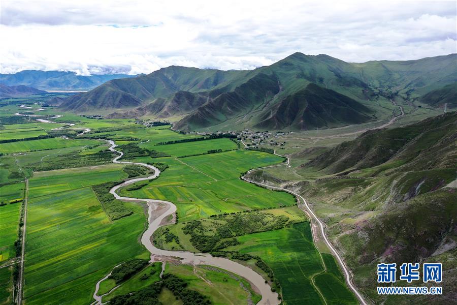 拉薩市林周縣邊交林鄉(xiāng)田園景色(7月14日攝,無人機照片)。林周縣地處西藏中部,拉薩河上游。夏日時節(jié),這里水草豐茂,綠意盎然,河流、村落、農田組成一幅美麗的田園畫卷。新華社記者 詹彥 攝