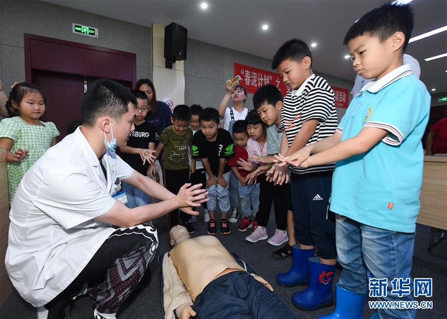7月16日,東林鎮(zhèn)衛(wèi)生院的醫(yī)護(hù)人員(左一)在給學(xué)生們示范和講解心肺復(fù)蘇的操作知識(shí)。當(dāng)日,浙江省湖州市吳興區(qū)東林鎮(zhèn)舉辦暑期“安全防護(hù)小超人”主題活動(dòng)?;顒?dòng)由醫(yī)護(hù)人員、消防隊(duì)員等為學(xué)生及家長(zhǎng)講授日常安全避險(xiǎn)及溺水急救知識(shí),中小學(xué)們還在現(xiàn)場(chǎng)學(xué)習(xí)了簡(jiǎn)易包扎、心肺復(fù)蘇的正確方式,并了解滅火器、滅火毯等消防器材的使用,為學(xué)生平安過(guò)暑期打好安全防護(hù)“預(yù)防針”。新華社記者 徐昱 攝