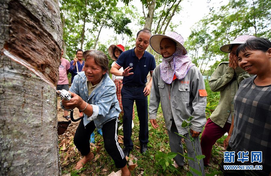 7月15日,瓊中縣什運(yùn)鄉(xiāng)便文村貧困戶(hù)在技術(shù)人員指導(dǎo)下試用電動(dòng)割膠刀。當(dāng)日,海南瓊中黎族苗族自治縣什運(yùn)鄉(xiāng)為542名貧困戶(hù)免費(fèi)發(fā)放電動(dòng)割膠刀,割膠刀研發(fā)單位為貧困戶(hù)提供使用技能培訓(xùn)。海南有著豐富的天然橡膠資源,但傳統(tǒng)膠刀的割膠技術(shù)要求高,農(nóng)民難以掌握,許多膠林閑置。電動(dòng)割膠刀使割膠簡(jiǎn)單易學(xué),幫助村民提高割膠效率,助力脫貧增收。新華社記者郭程攝