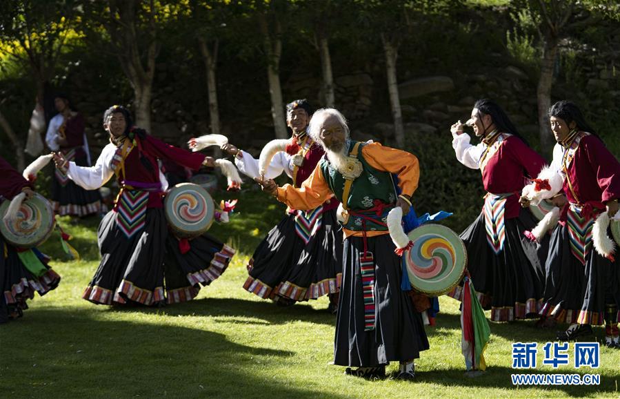 尼瑪(中)和弟子們正在表演“久河卓舞”(7月1日攝)。新華社記者普布扎西攝