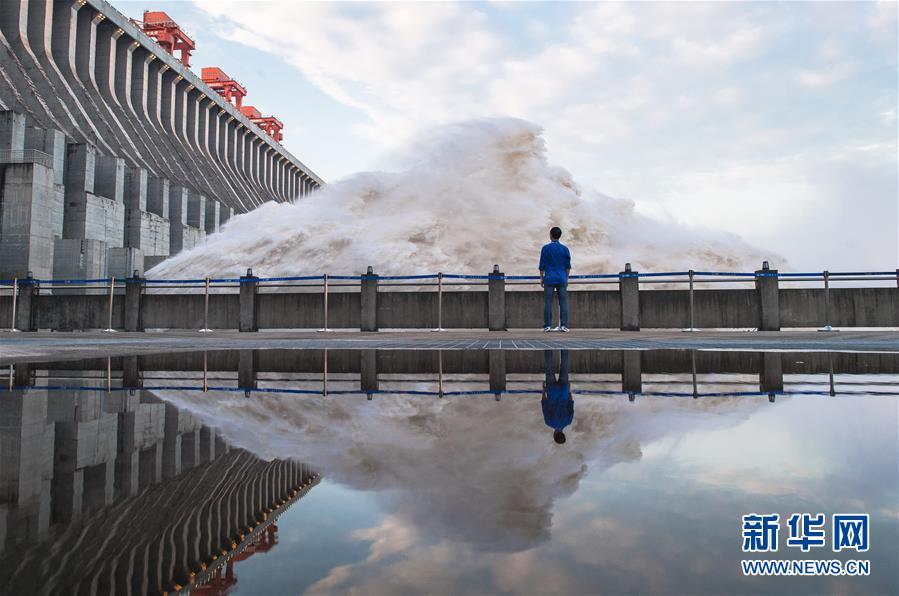 7月19日,工作人員在三峽樞紐前巡查。19日20時(shí),三峽水庫入庫流量4.6萬立方米/秒,較本輪洪水的峰值6.1萬立方米/秒下降了1.5萬立方米/秒?!伴L江2020年第2號洪水”平穩(wěn)通過三峽大壩。新華社記者肖藝九攝