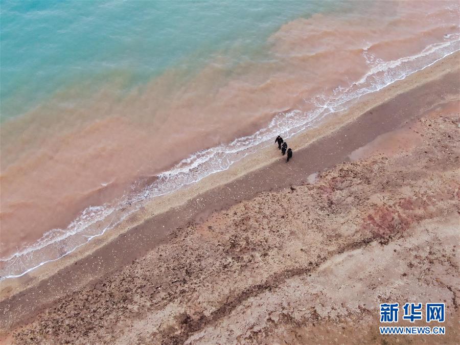 在可可西里索南達(dá)杰保護站管護區(qū)域內(nèi)的湖泊附近,龍周才加(中)與隊友才仁多杰(左)、王文豪在巡視(6月30日攝,無人機照片)。新華社記者張龍攝