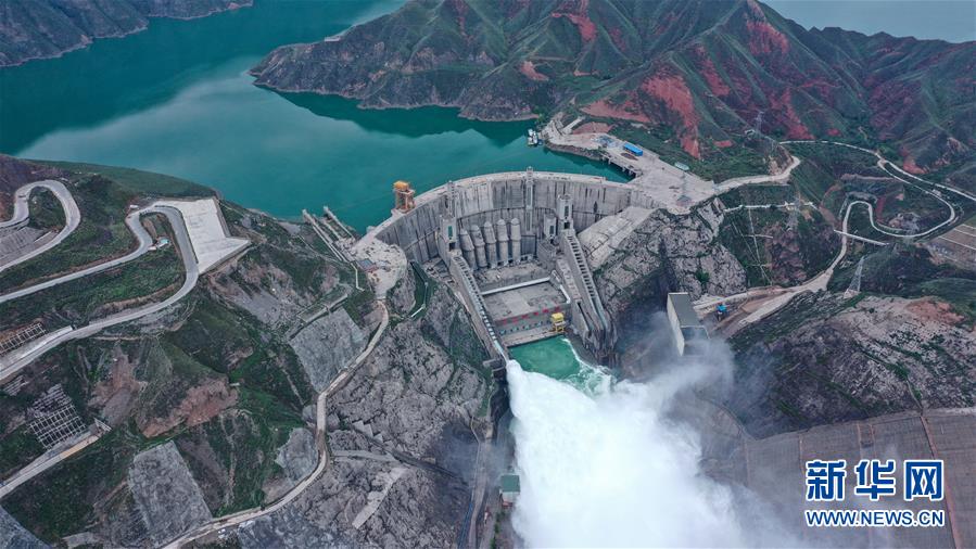 7月9日,位于青海省尖扎縣和化隆縣交界處的李家峽水電站提門泄水(無人機照片)。新華社記者吳剛攝