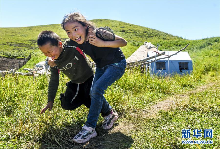 在新疆伊犁特克斯縣境內(nèi)的夏牧場里,兩名小朋友在玩耍(7月2日攝)。新華社記者王菲攝
