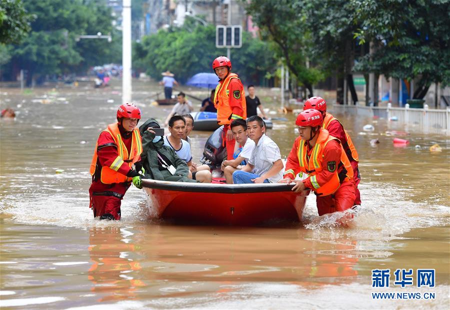 7月11日,廣西融水消防救援大隊的救援人員在轉(zhuǎn)移被困群眾。受連日強降雨影響,廣西柳州市融水苗族自治縣融江水位暴漲,導(dǎo)致縣城出現(xiàn)嚴(yán)重洪澇災(zāi)害。新華社記者黃孝邦攝