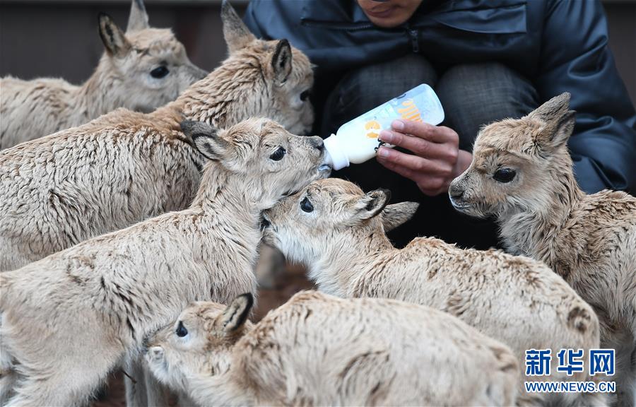 7月7日,三江源國家公園管理局長江源園區(qū)可可西里管理處卓乃湖保護站的工作人員才文多杰在給藏羚羊幼仔喂奶。新華社記者薛玉斌攝