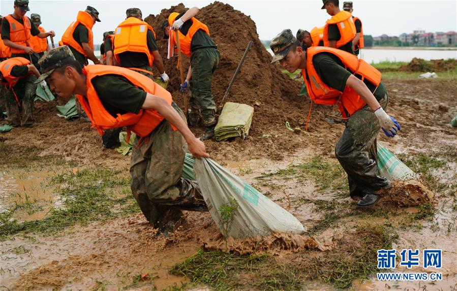 7月11日,武警戰(zhàn)士在江西省鄱陽縣鄱陽鎮(zhèn)江家?guī)X村搬運(yùn)沙袋。新華社記者周密攝